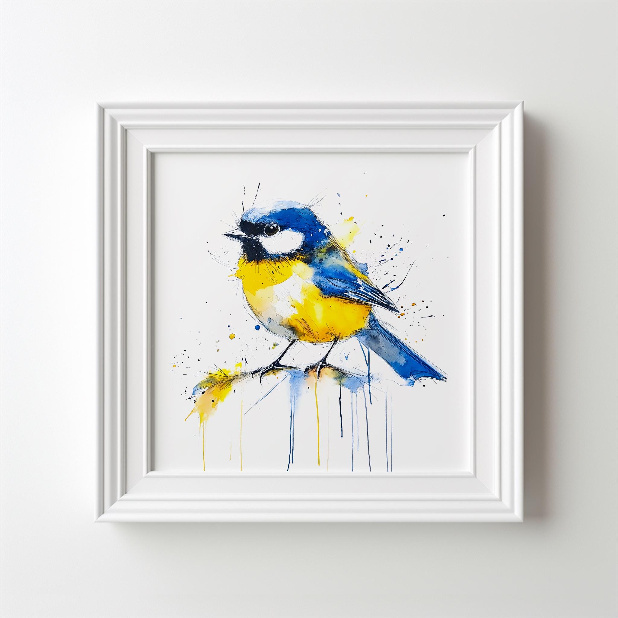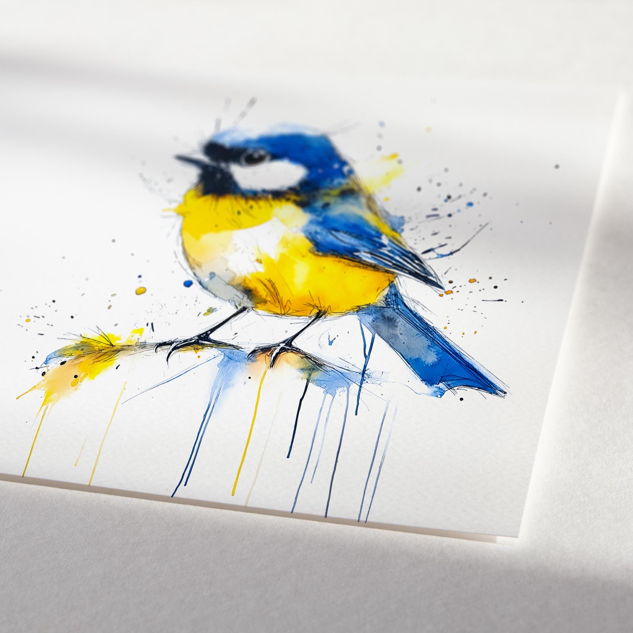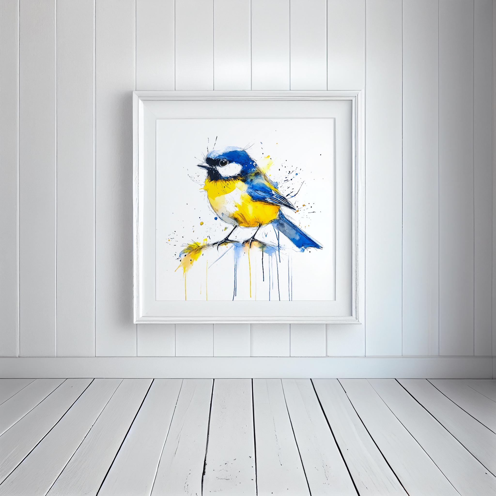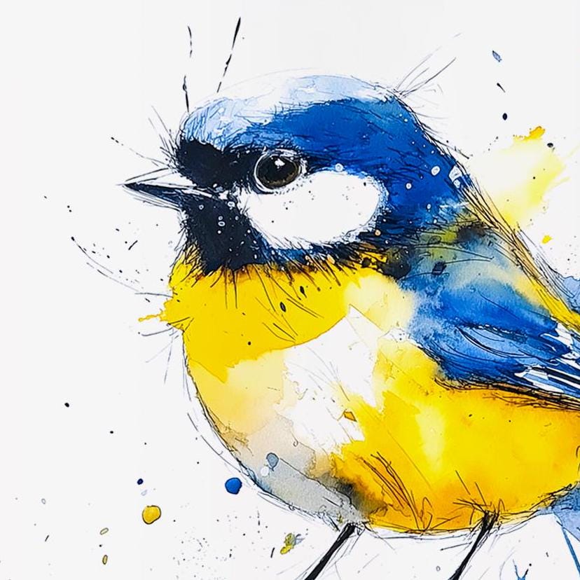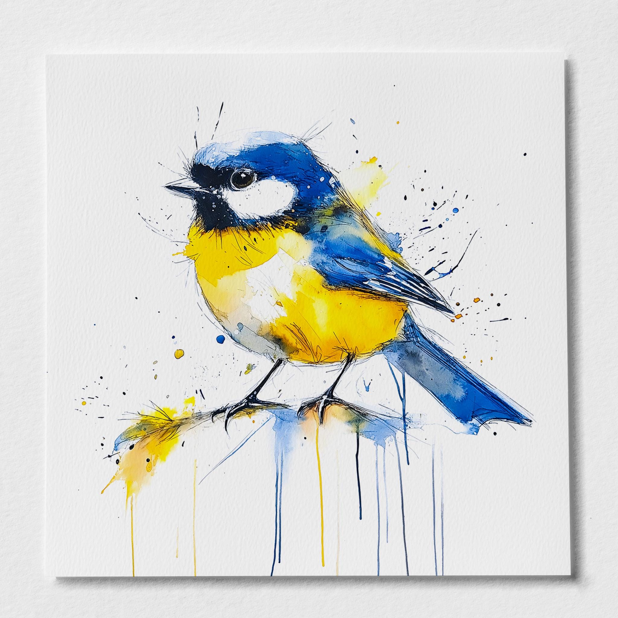 Blue Tit Painting - Hand signed contemporary Blue Tit print on watercolour paper. Bold and expressive with lots of character, my paintings of birds are a firm favourite amongst nature lovers and bird watchers alike. My British garden bird paintings have been published by the National Trust several times as gift cards and are for sale in cards shops nationwide through Museums and Galleries.