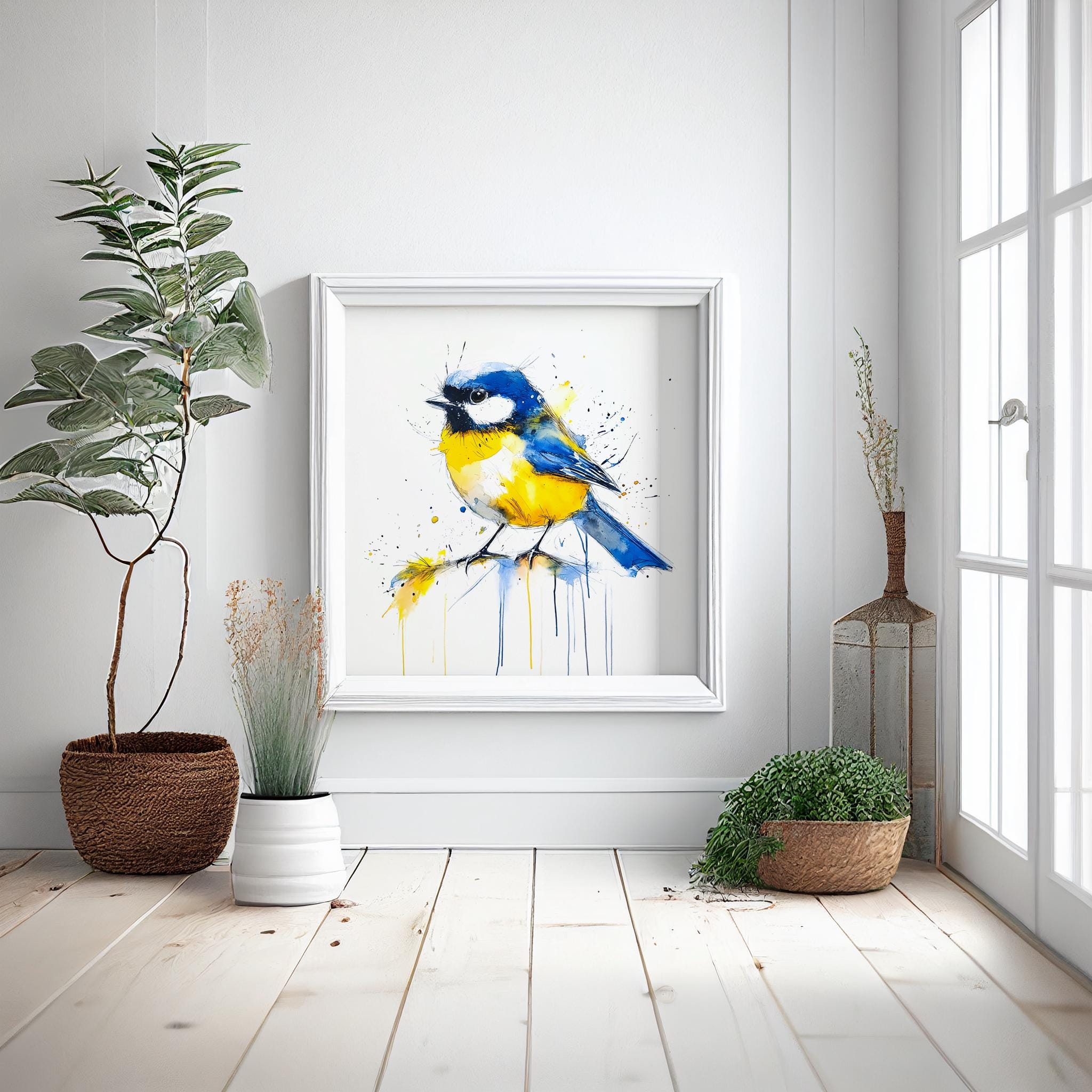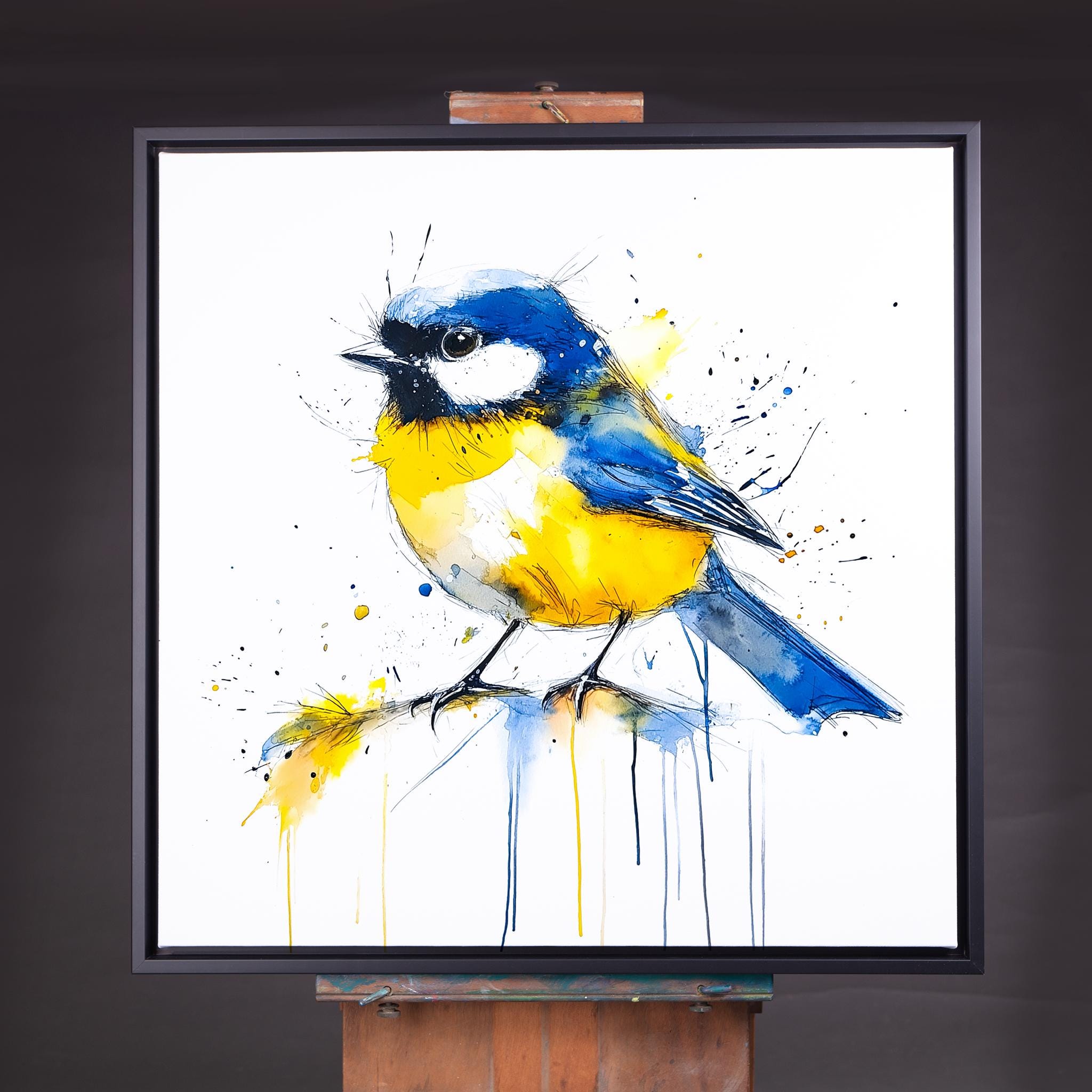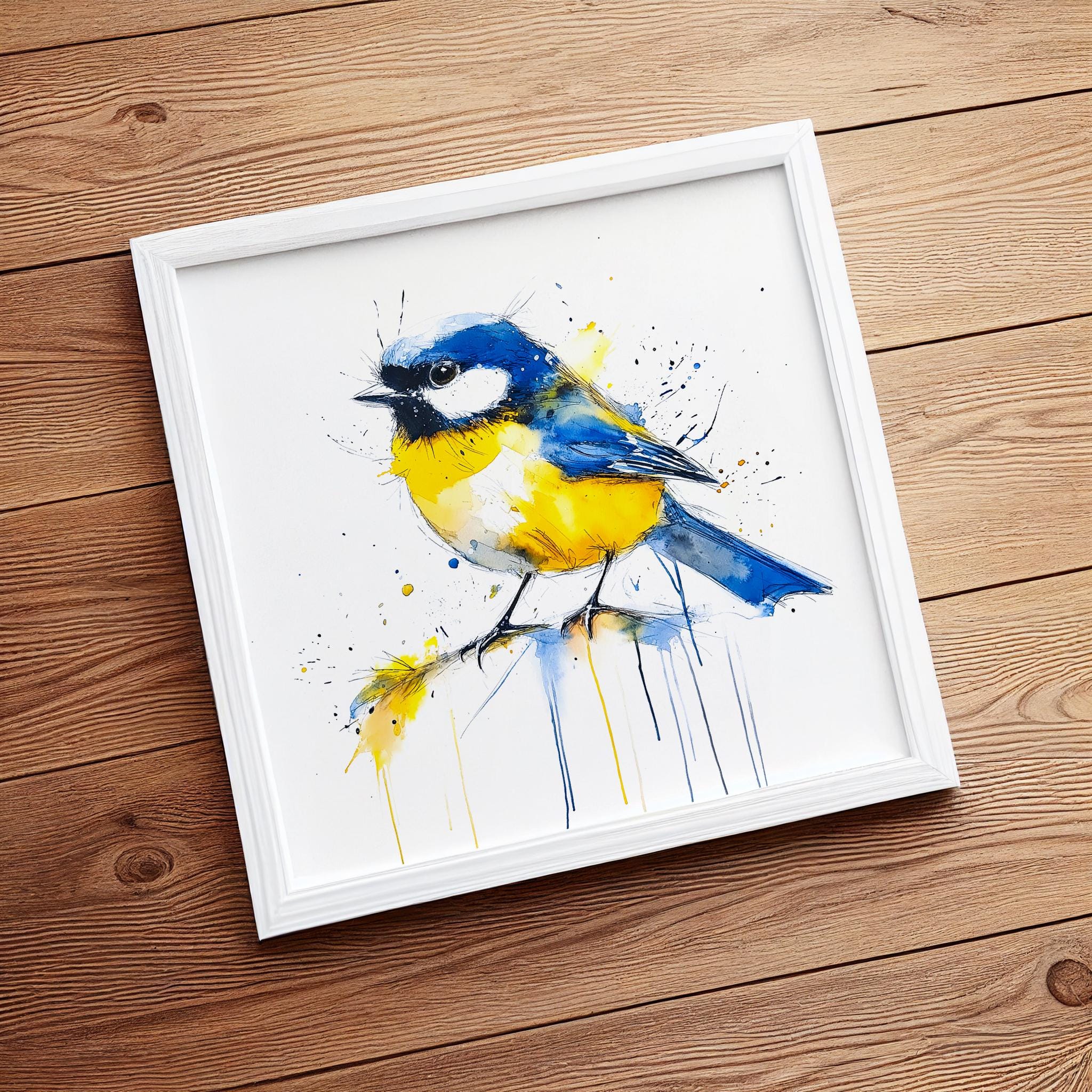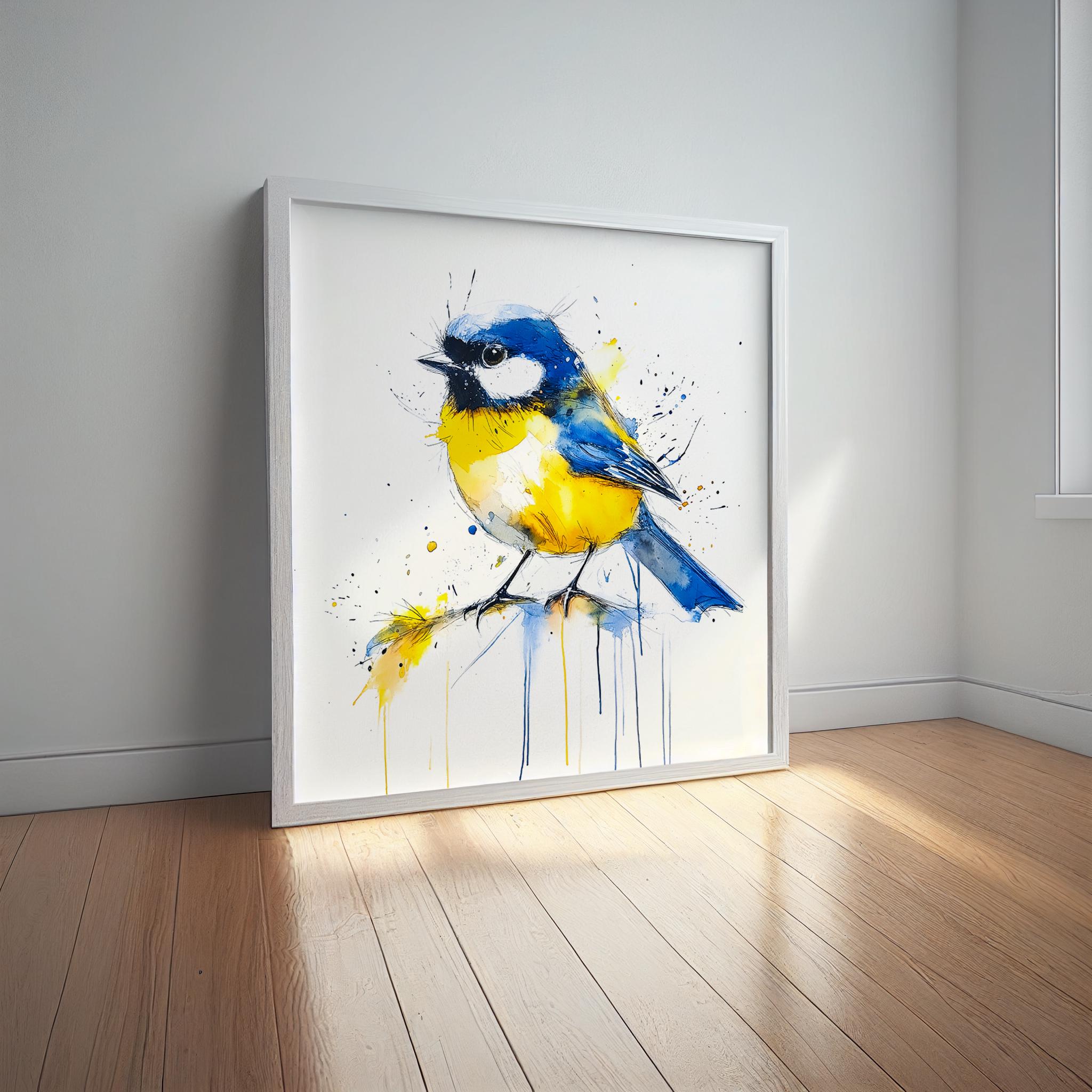 Blue Tit Painting - Hand signed contemporary Blue Tit print on watercolour paper. Bold and expressive with lots of character, my paintings of birds are a firm favourite amongst nature lovers and bird watchers alike. My British garden bird paintings have been published by the National Trust several times as gift cards and are for sale in cards shops nationwide through Museums and Galleries.