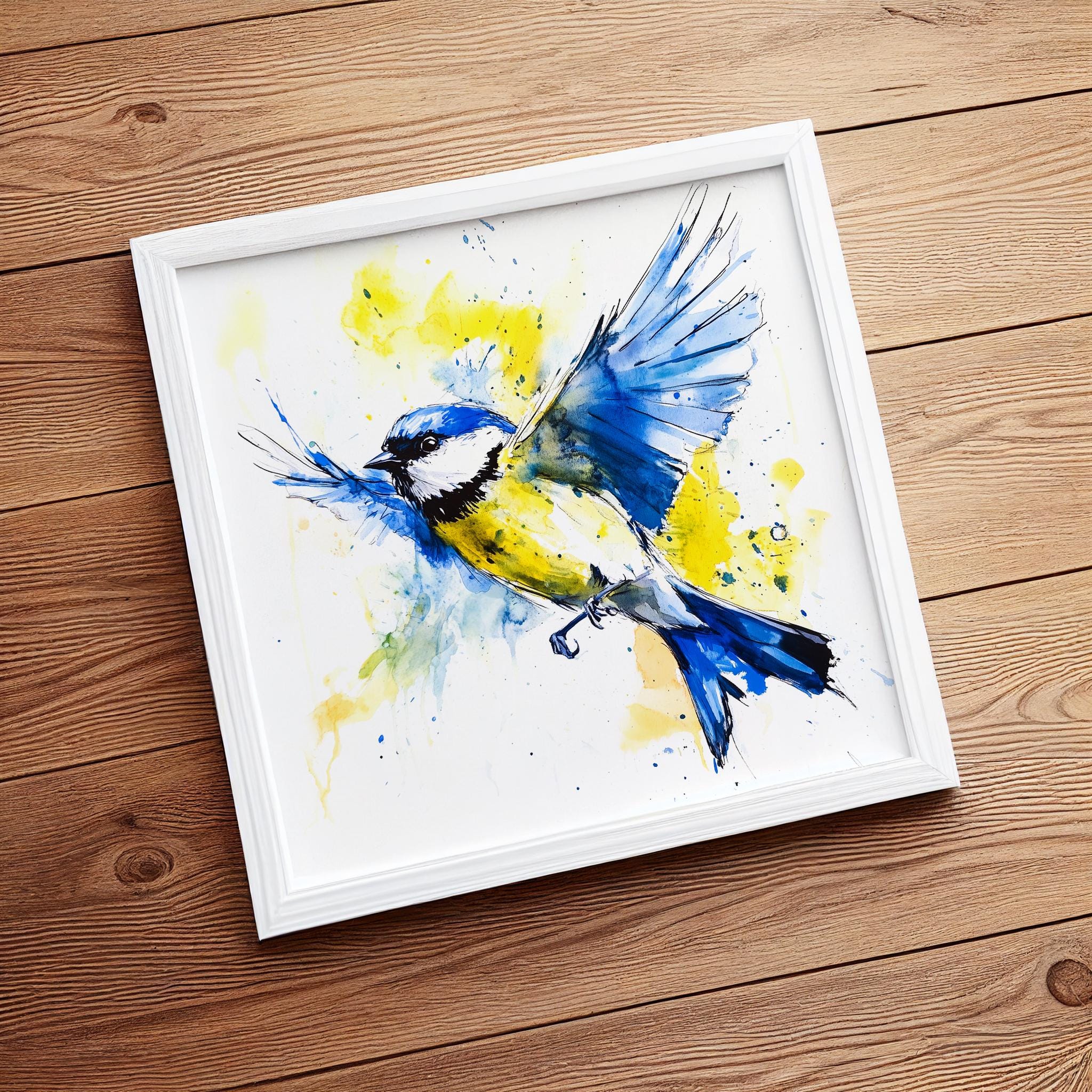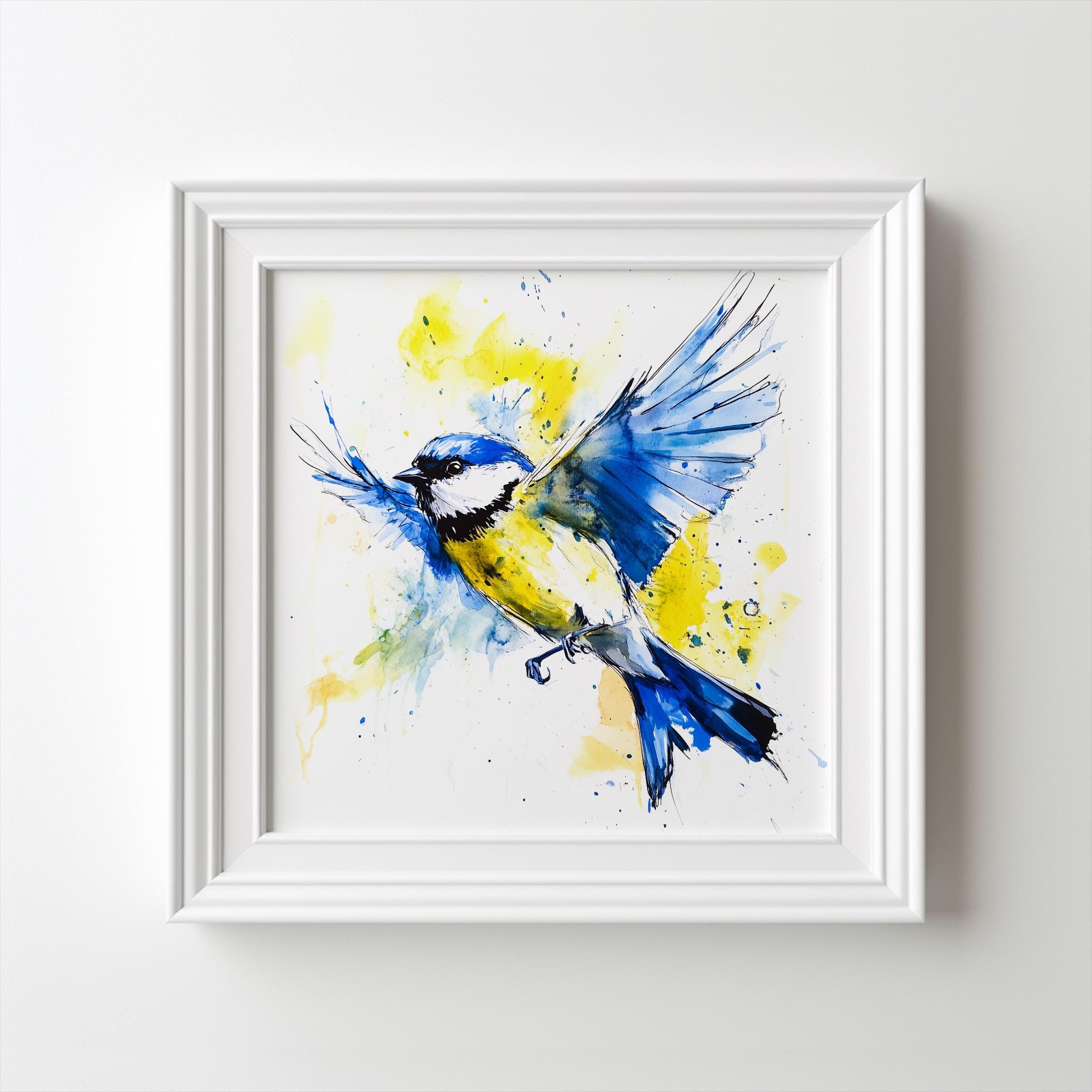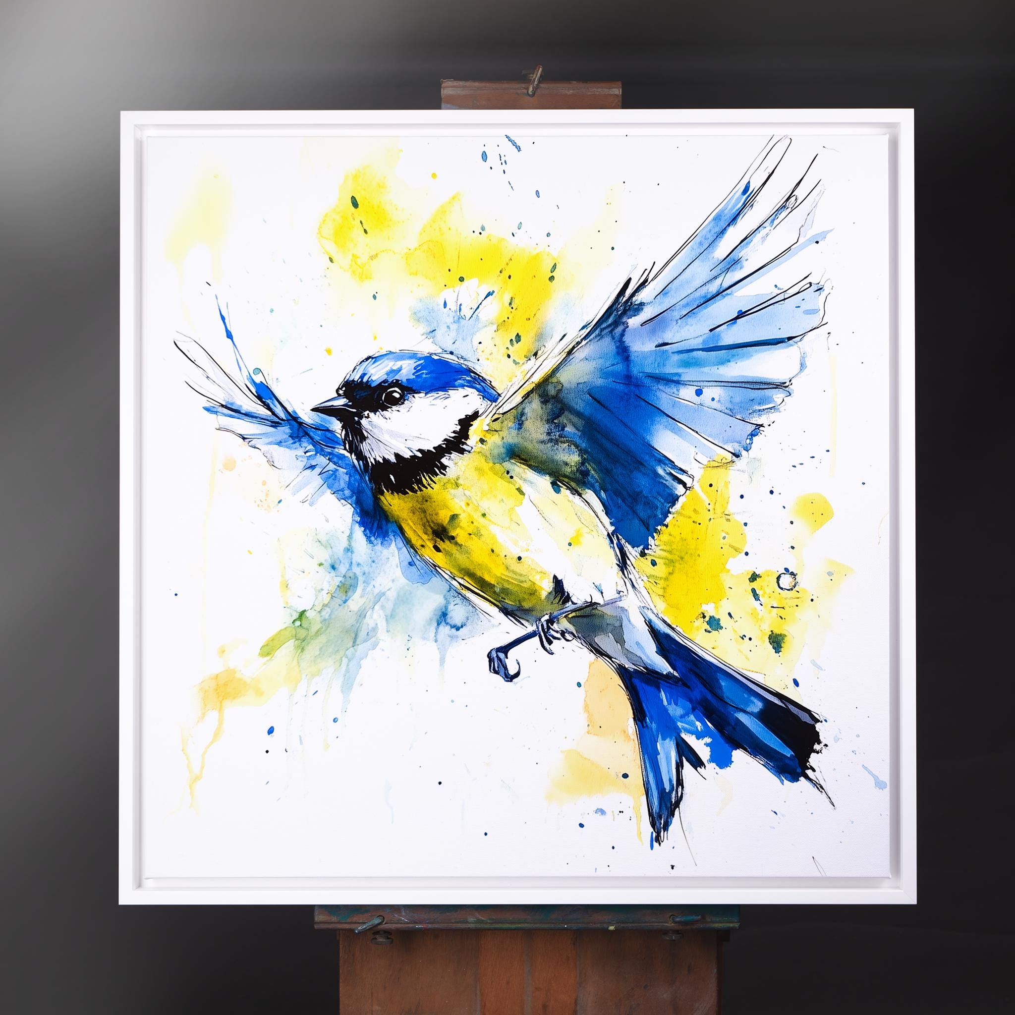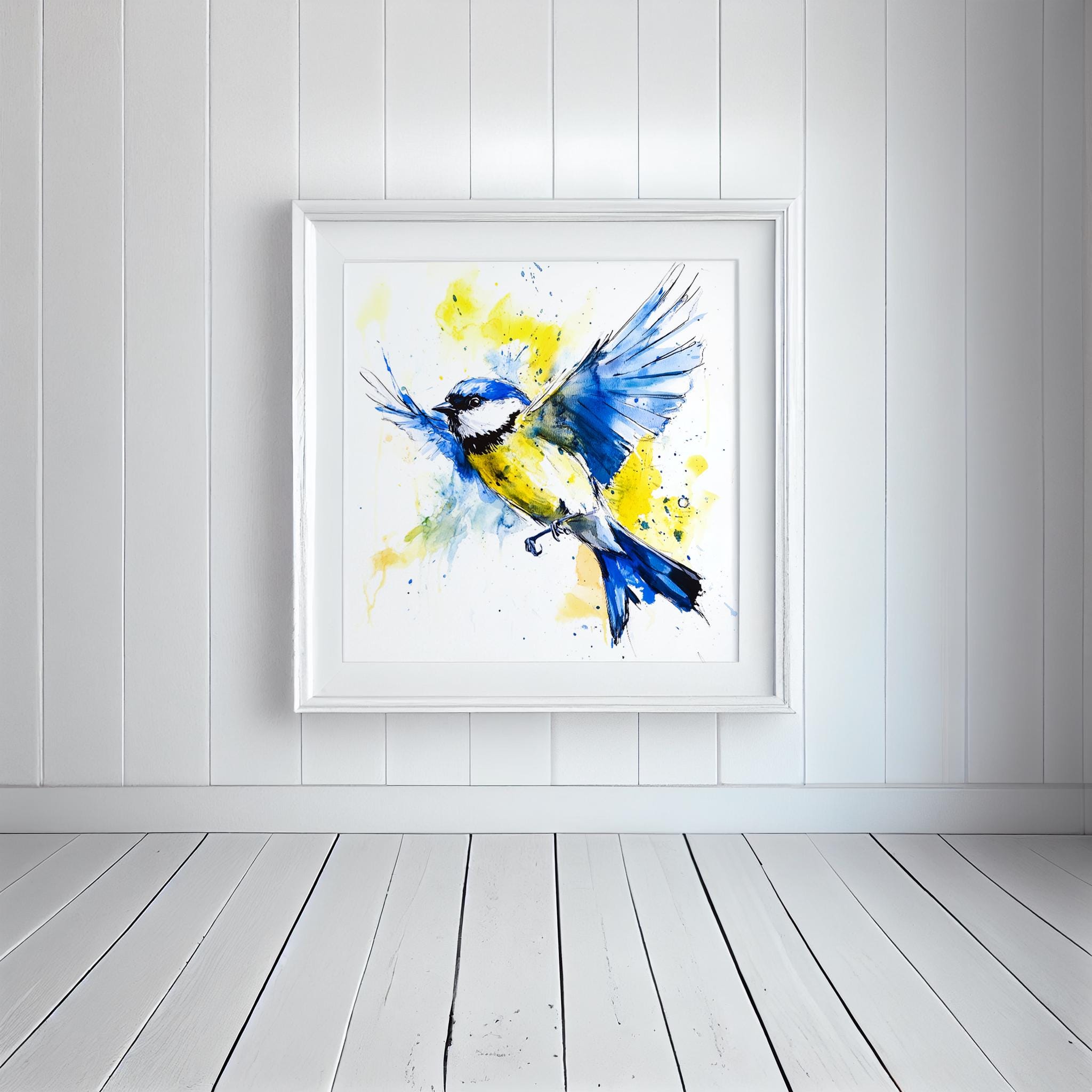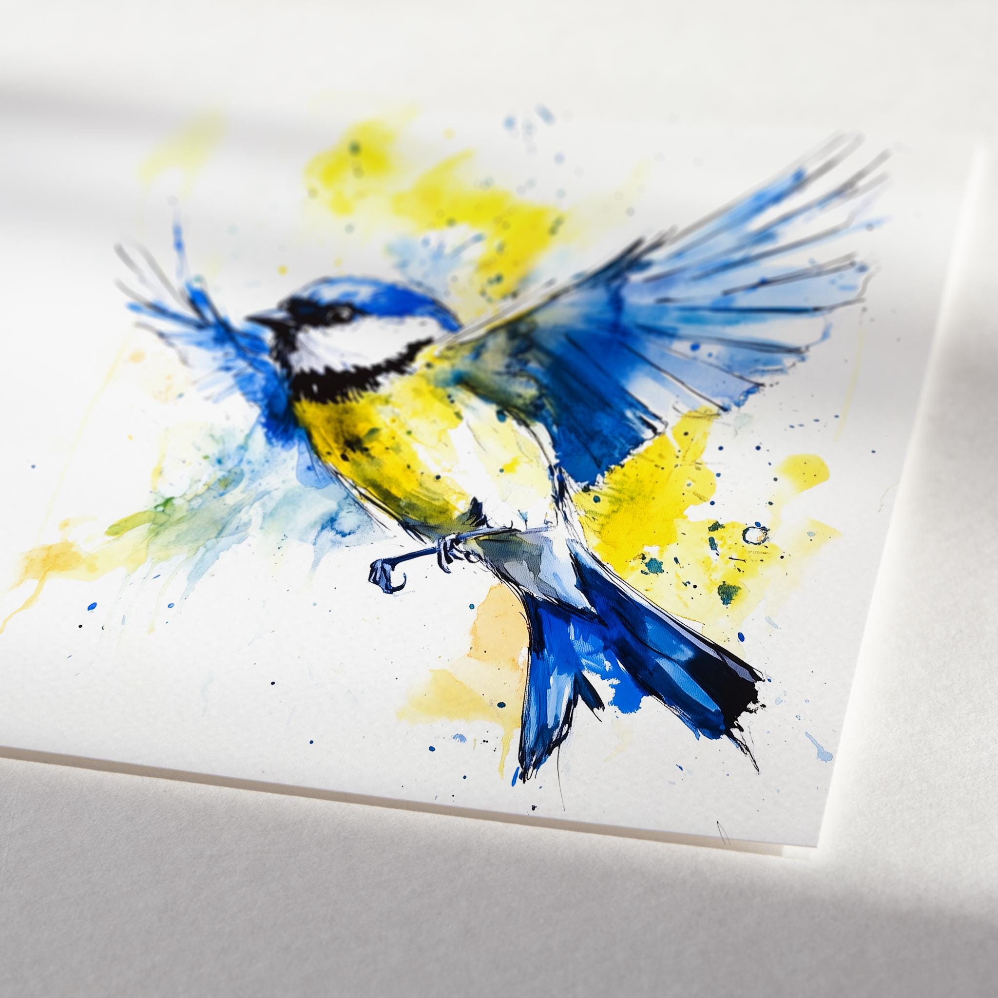 Blue Tit Painting - Hand signed contemporary Blue Tit in flight print on watercolour paper. Bold and expressive with lots of character, my paintings of British garden birds are a firm favourite amongst nature lovers and bird watchers alike. My bird paintings have been published by the National Trust several times as gift cards and are for sale in cards shops nationwide through Museums and Galleries.