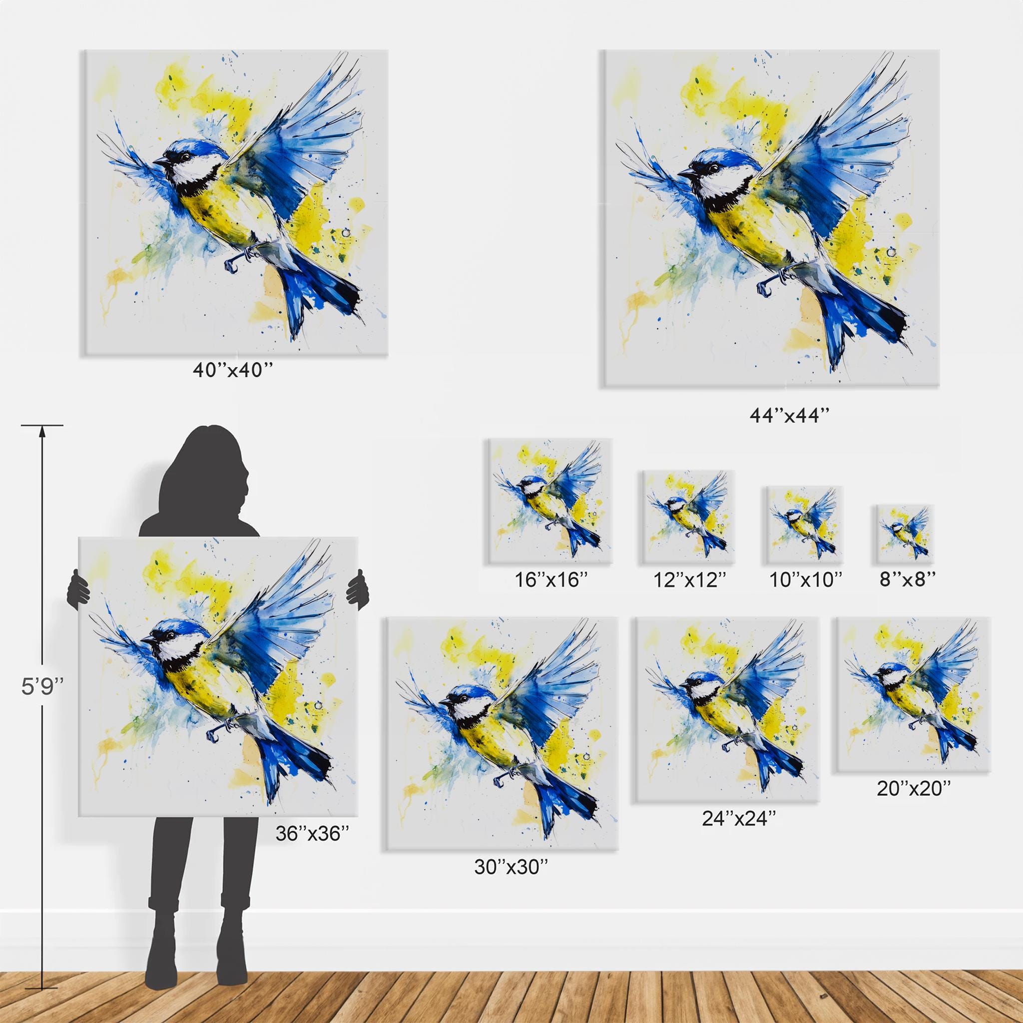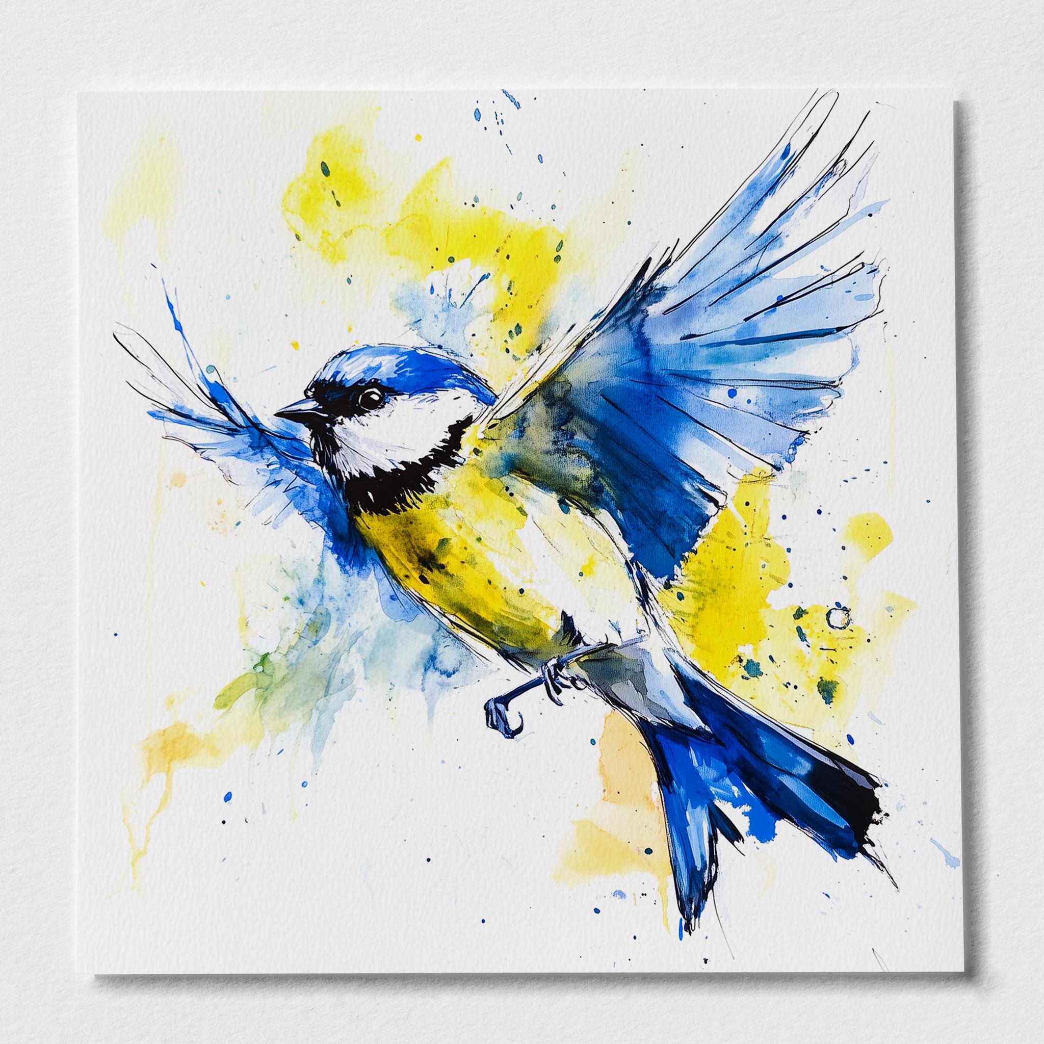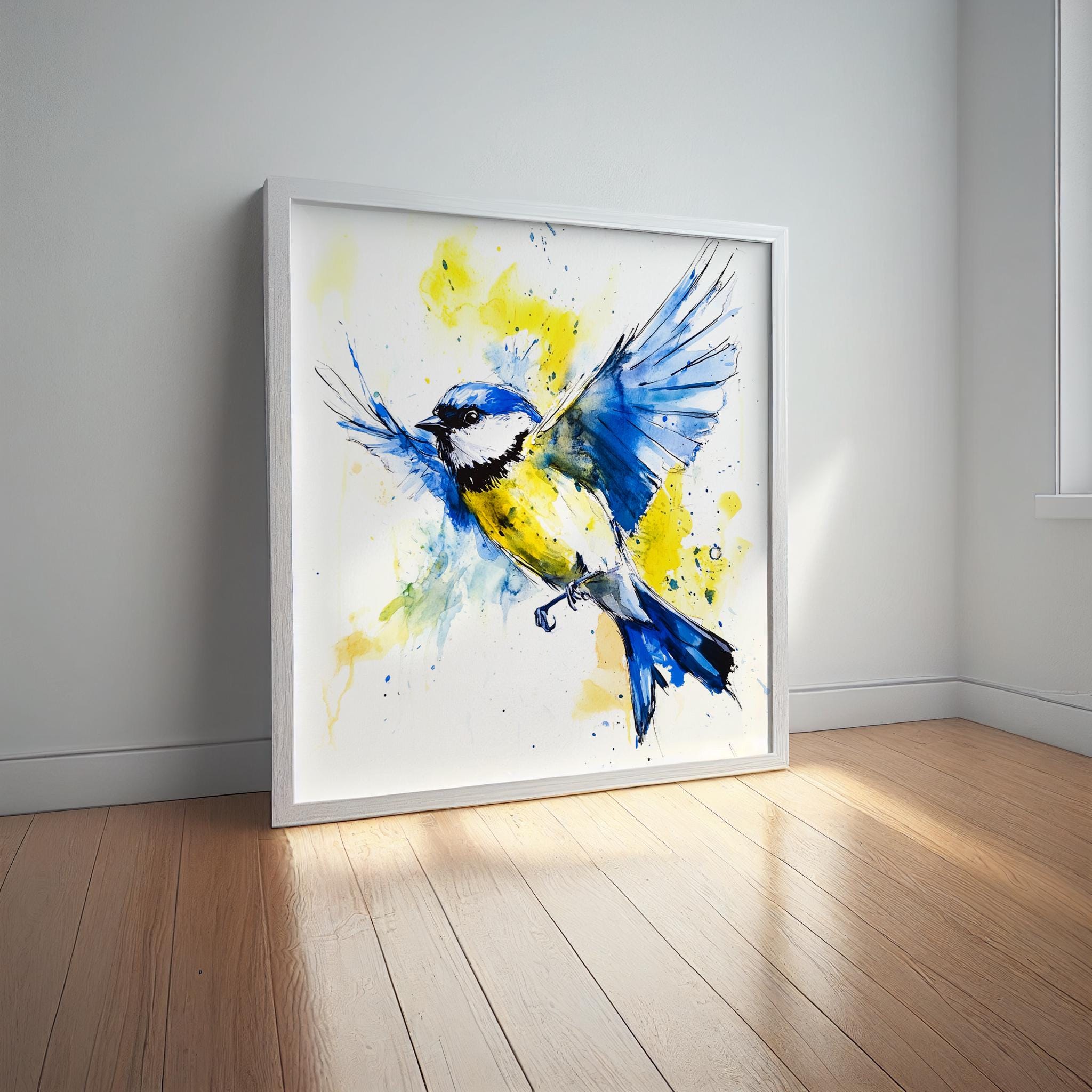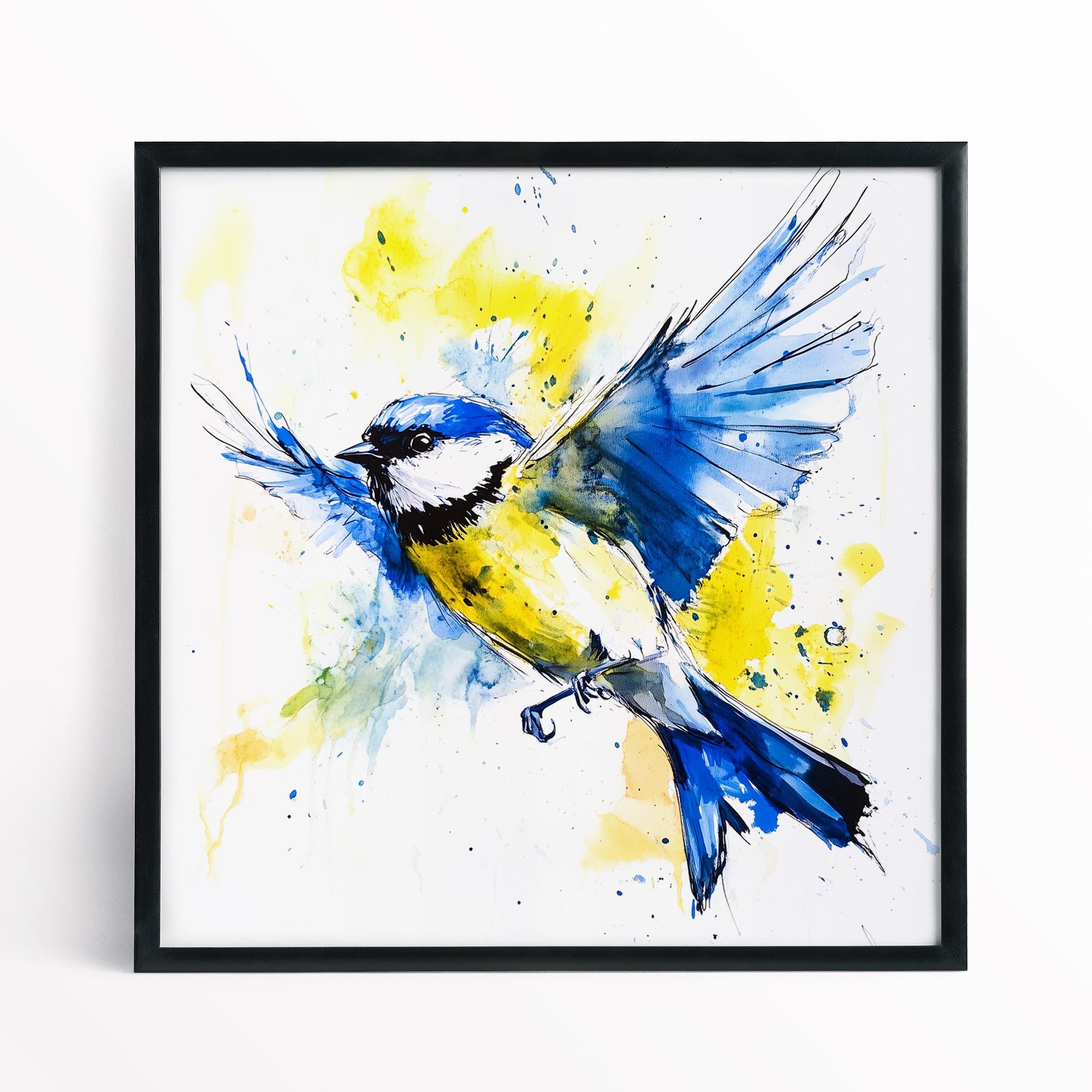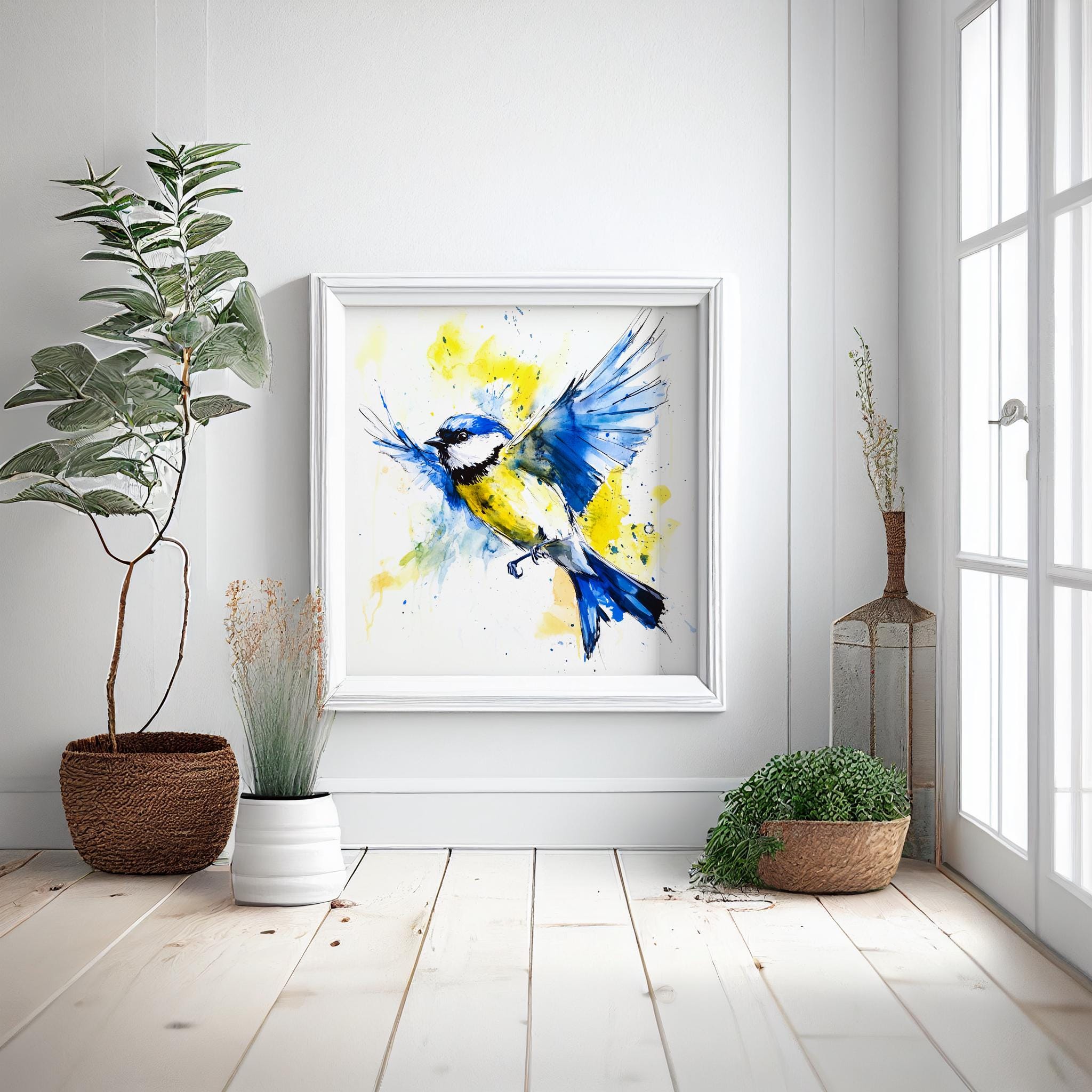 Blue Tit Painting - Hand signed contemporary Blue Tit in flight print on watercolour paper. Bold and expressive with lots of character, my paintings of British garden birds are a firm favourite amongst nature lovers and bird watchers alike. My bird paintings have been published by the National Trust several times as gift cards and are for sale in cards shops nationwide through Museums and Galleries.